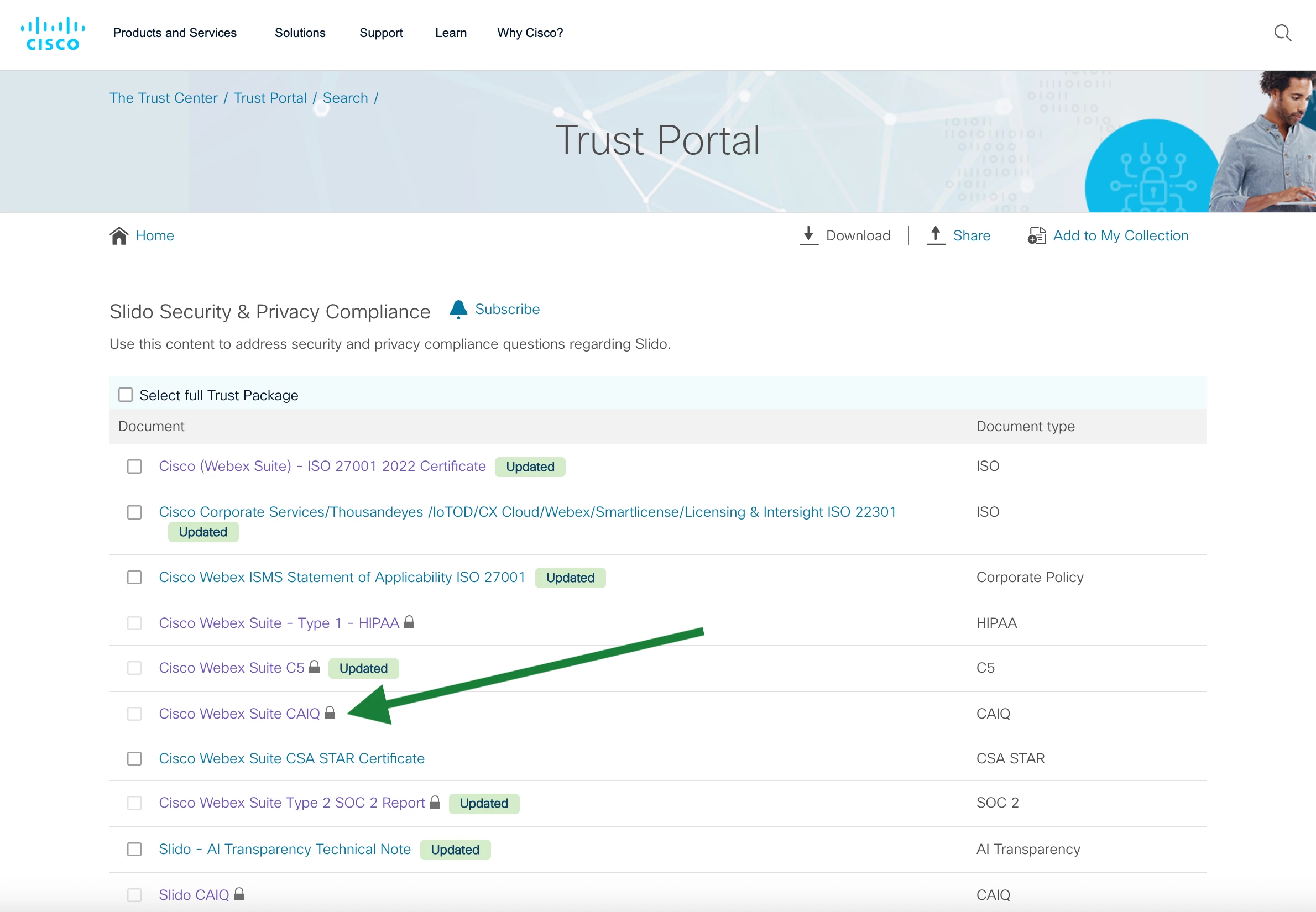 Slido has been a part of Cisco’s family of products since 2021. This means that all of Slido’s security documentation is housed within Cisco’s self-service Trust Portal tool.