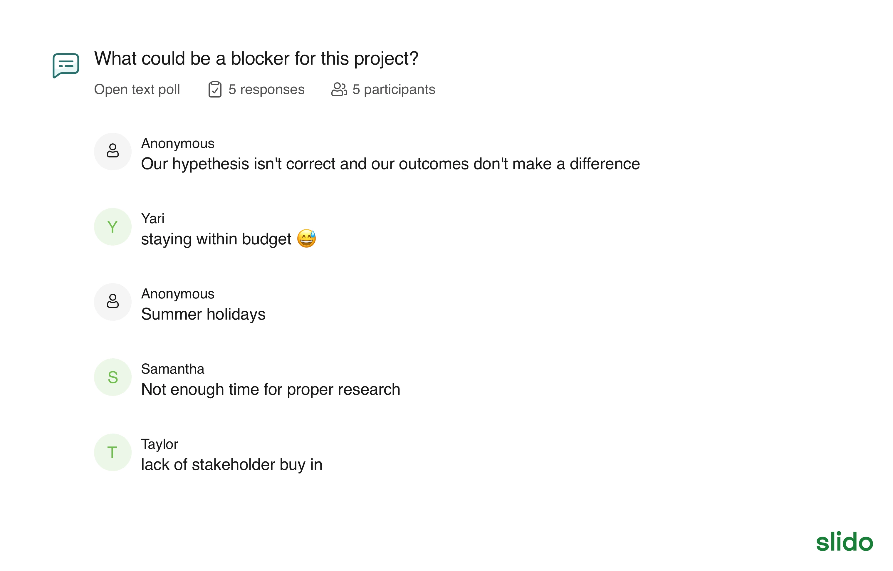 Some meeting hosts like to be interrupted when someone has a relevant question, while others like to finish before taking questions. No matter what style you choose, Slido Q&A provides a safe, transparent and efficient way for team members to ask questions and upvote others.