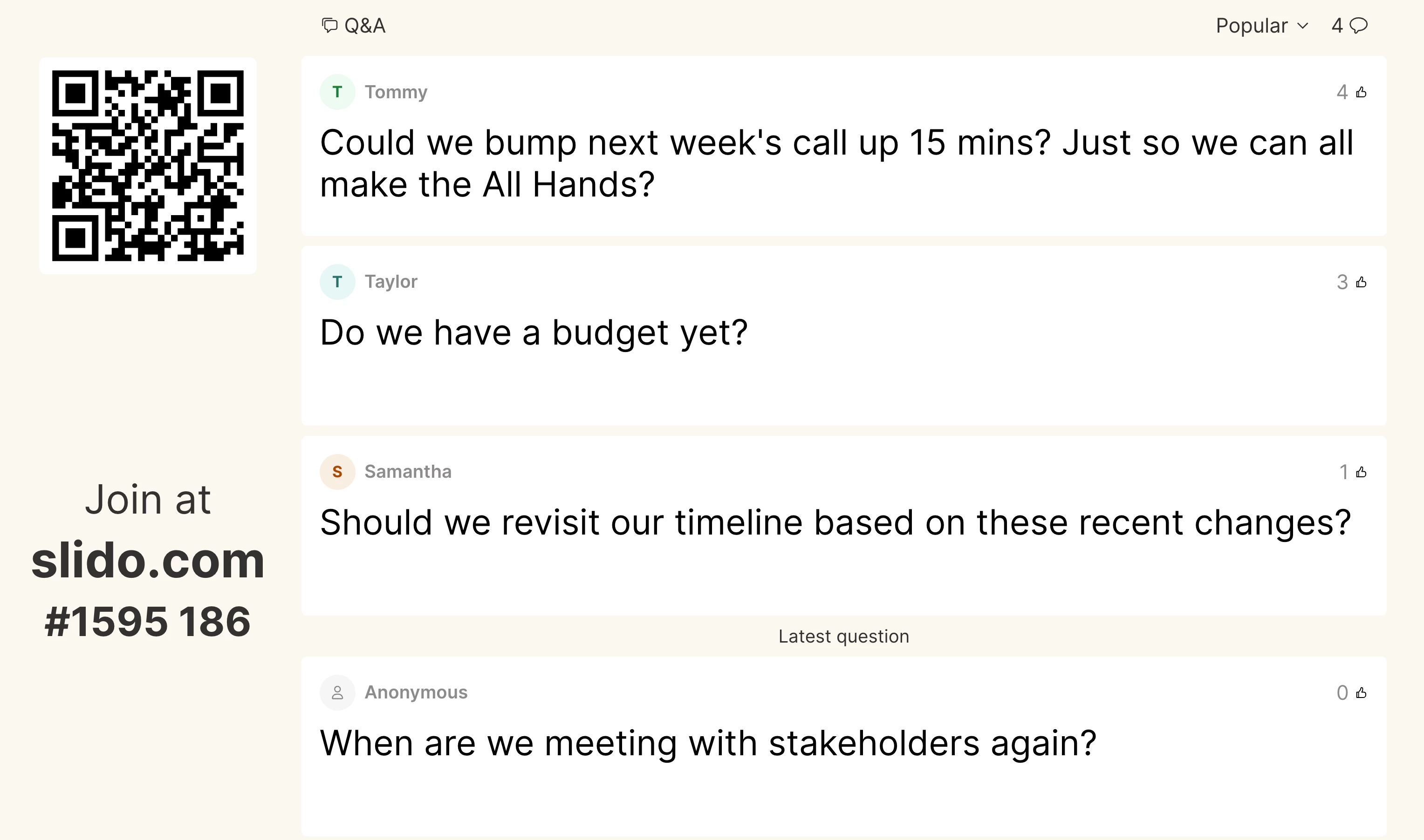 Use Slido Q&A so team members can ask questions at any time without interrupting.