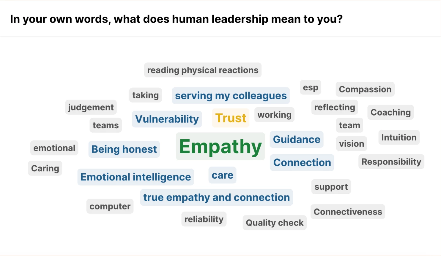 When we asked webinar participants “What does human leadership mean to you?”, our Slido word cloud highlighted themes like empathy, trust, care, guidance and connection. A very powerful confirmation that these qualities matter deeply to today’s teams.