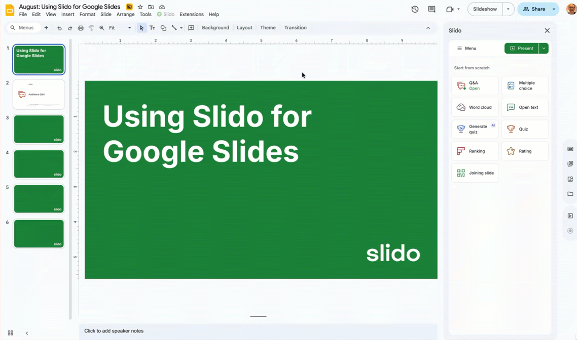 Please note: Add-ons for Google Slides are tied to specific Google accounts. For Slido polls to work, you need to be presenting from a Google account that has the Slido add-on installed.
