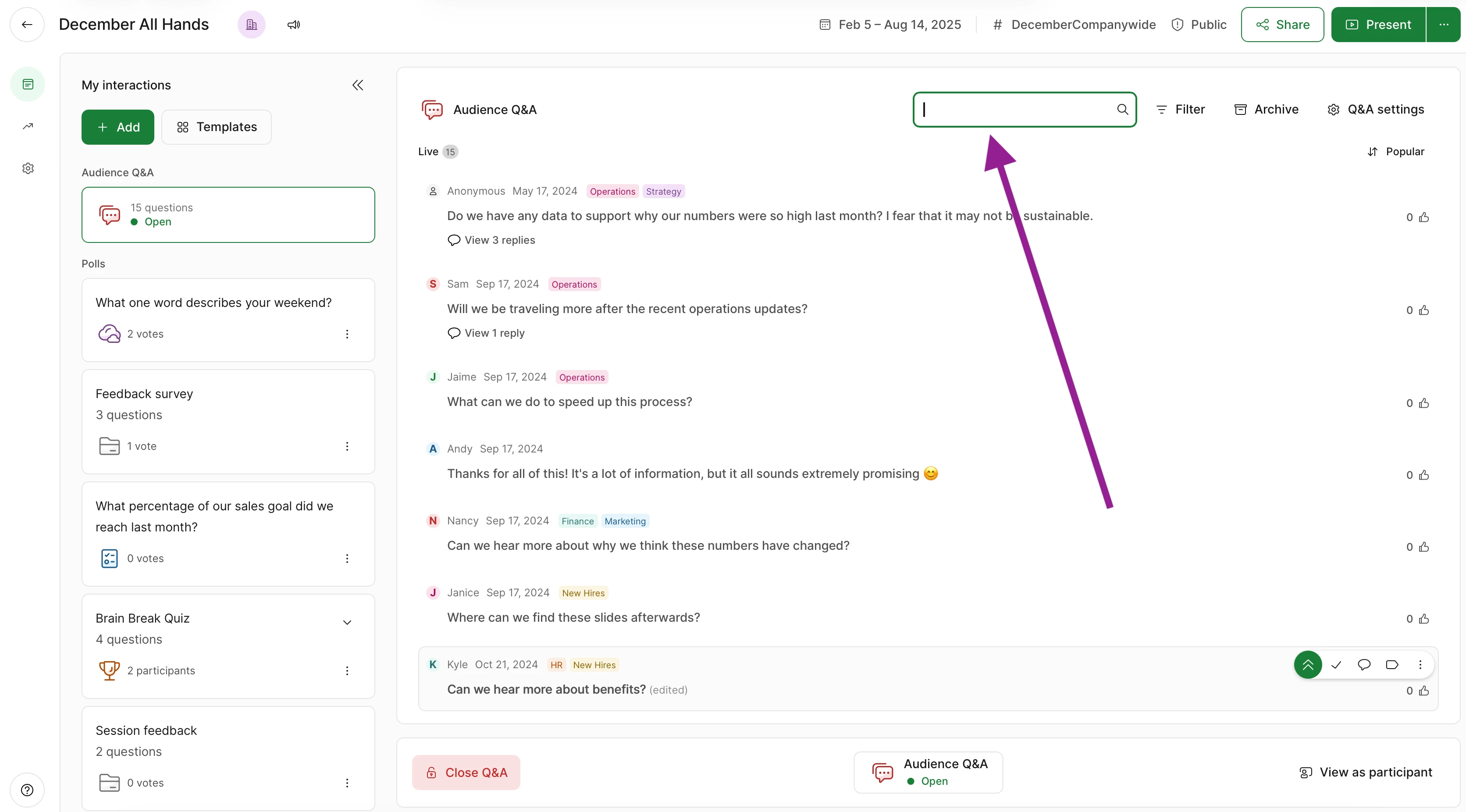 We recently held a large townhall and the search feature did not work. We tried to search by name of people that asked questions and support told us this feature does not work like this but it would be nice to search by name of people that asked questions. This would be helpful in events where you receive 100+ questions.