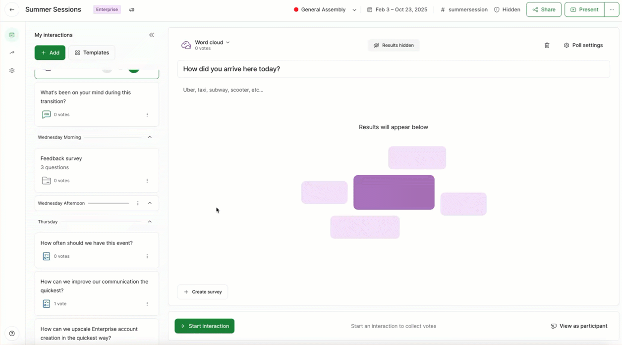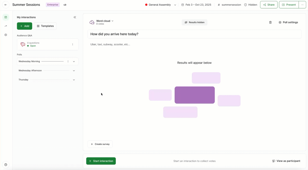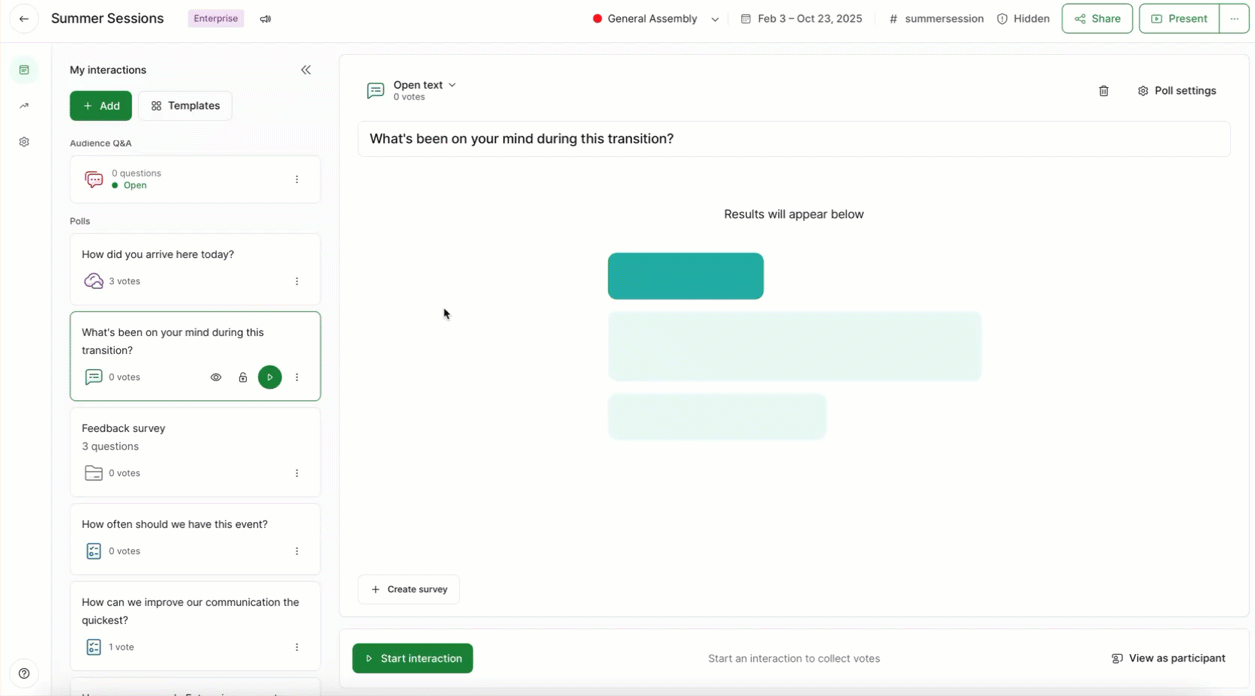 If you're running a lot of polls throughout your meeting or event, Slido Dividers can help give you a clear, organized view of your agenda. They’re perfect for when you have multiple speakers, multiple presentations or multiple topics.