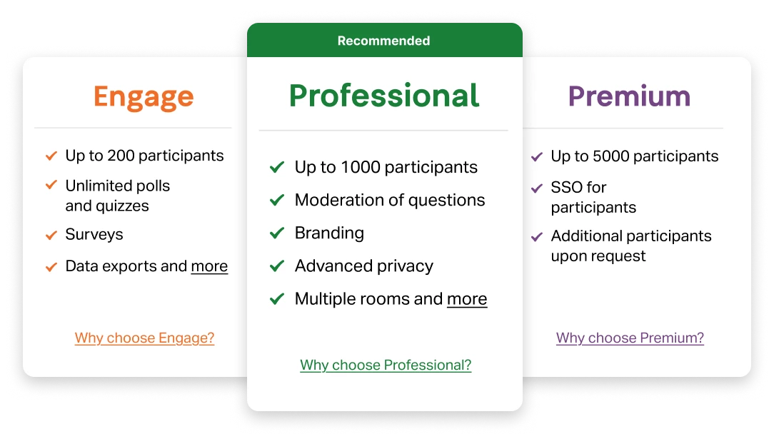 To get started using Slido for your event, you'll need to purchase a license. Head over to the Pricing Page, where you can explore our packages designed to suit different event sizes and needs.