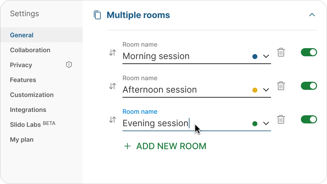 Slido’s Multiple Rooms feature allows you to create separate "rooms" within your slido, each with its own polling and Q&A. This setup is ideal for events with parallel tracks or multiple stages running at the same time.
