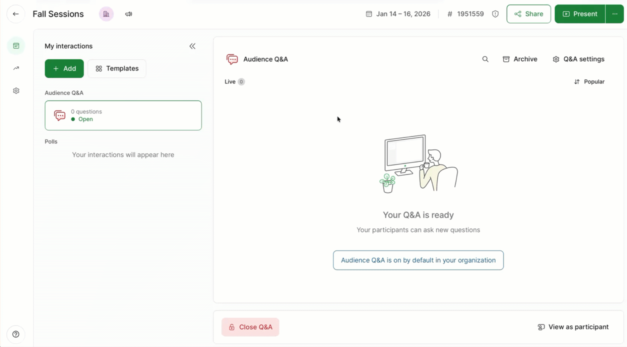 This is perfect for when you want to ask the same question(s) multiple times throughout your slido. It’s easy and it keeps all of the responses separate.