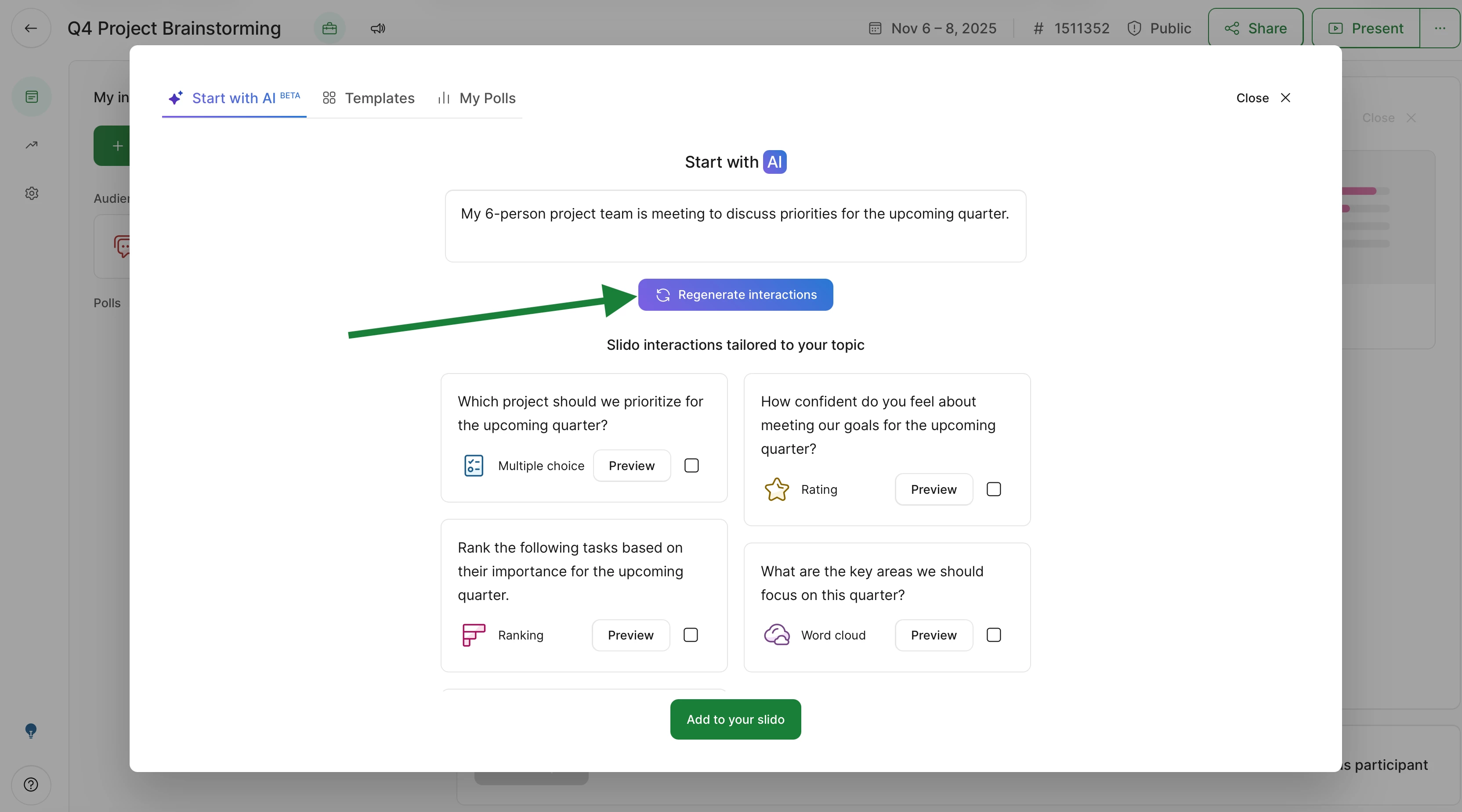 Select the polls you’d like to include and click Add to your slido. You’ll now see them appear under My interactions.