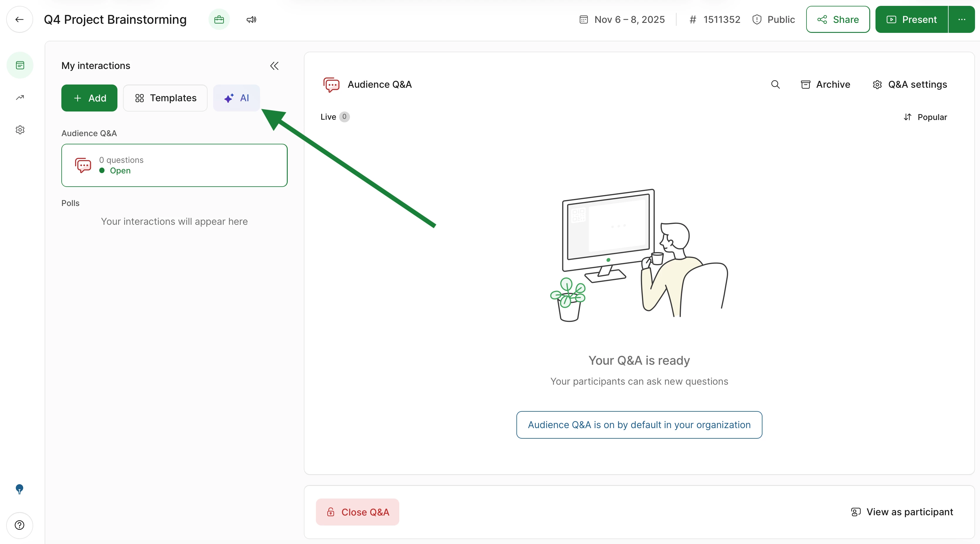 After you’ve created a new slido or opened up an existing one, find the AI button on the left.