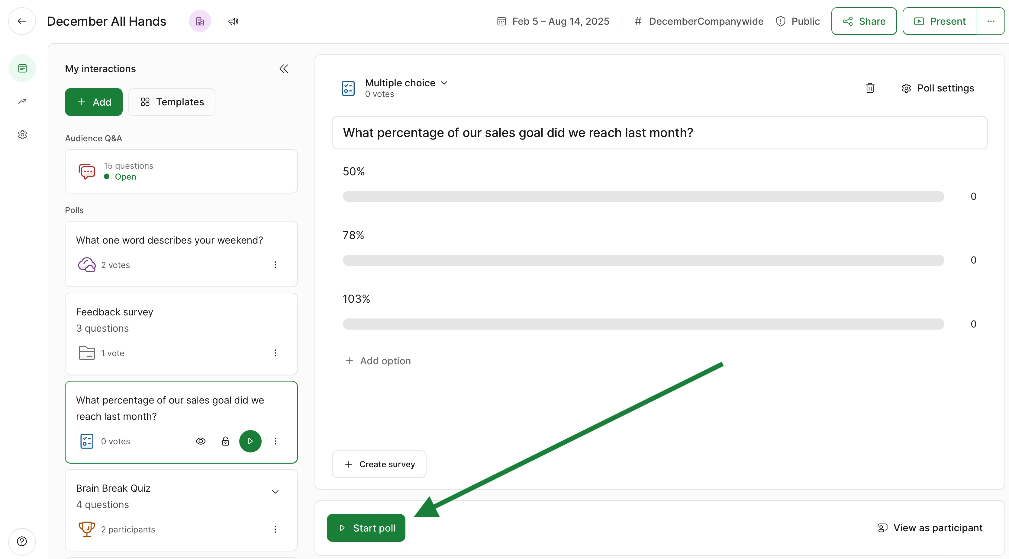 Start your poll by selecting it from under My interactions and clicking the green Start poll button near the bottom of the page.