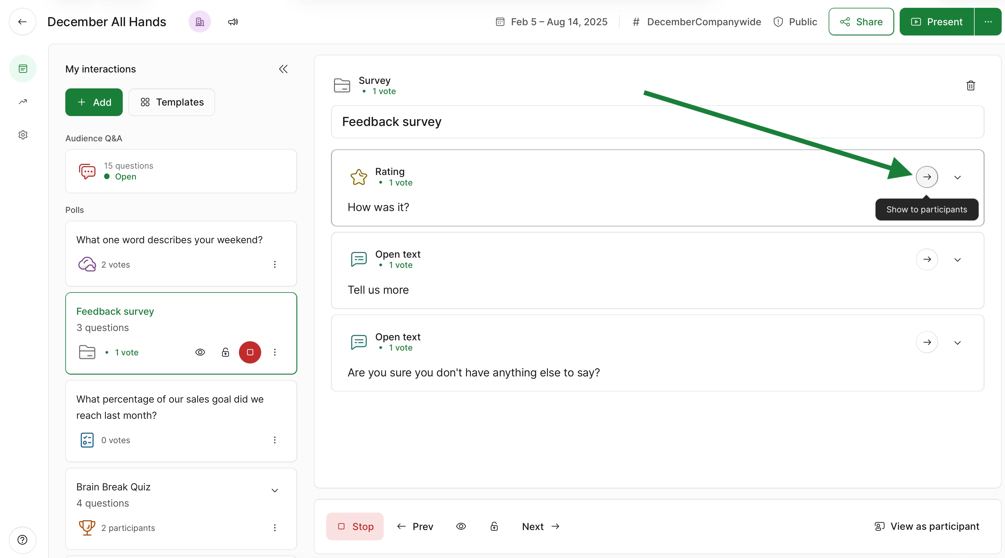 If you’d like to display your survey results for participants to see, you can do so one poll at a time. Just click the arrow icon next to the poll question. This will present the results for your participants to see on their own devices, as well as in your Present mode.